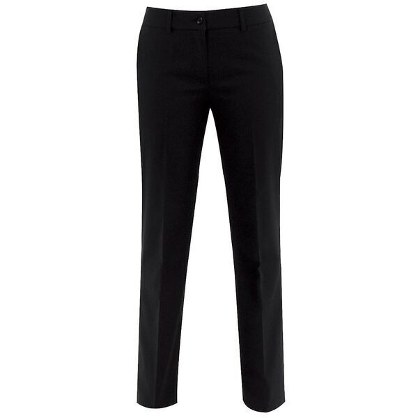 Pantalon femme. Ceinture 5 passants fermée par 1 bouton et 1 bouton intérieur, braguette à glissière. Poches italiennes, 2 poches dos fermées par bouton. Plis devant et dos marqués. Bas de jambe non fini. Coupe droite. E.J. : 90 cm.